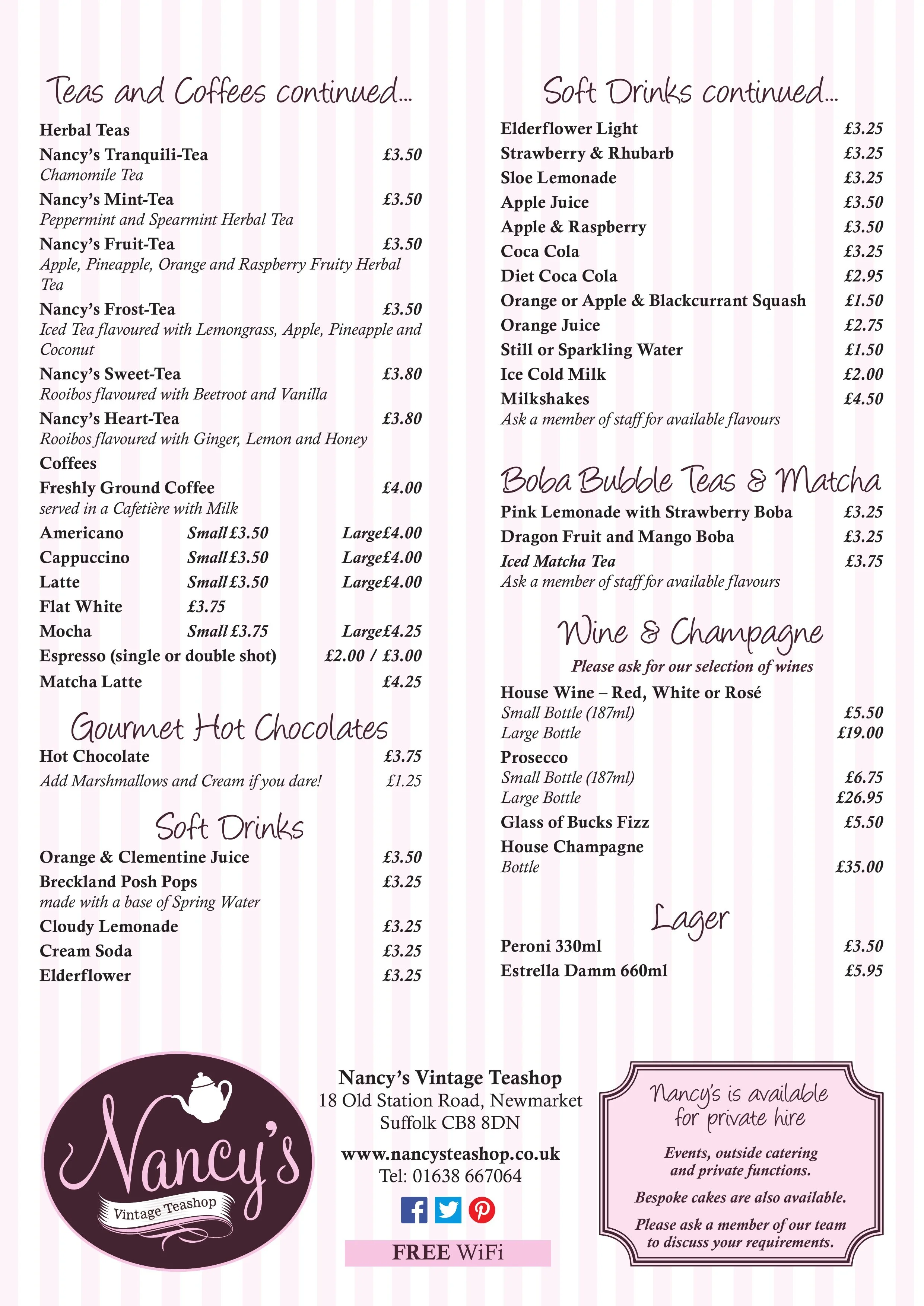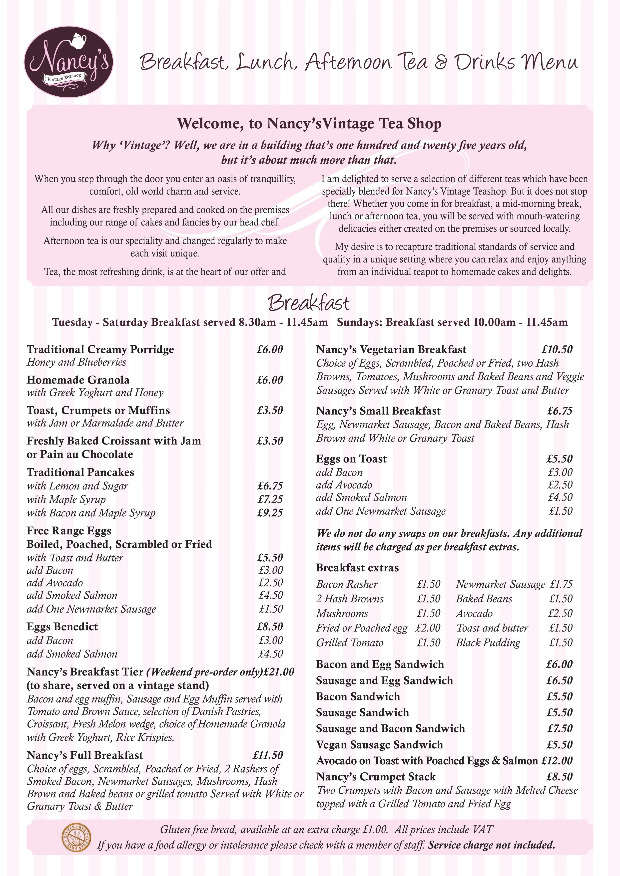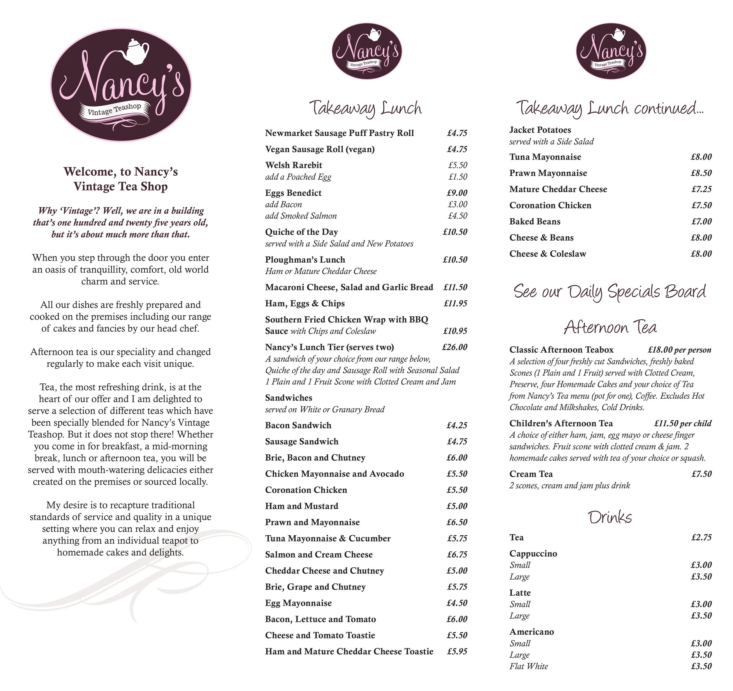 Nestled in the heart of Newmarket, the award-winning Nancy's Vintage Teashop is a distinctively quirky venue for breakfast, lunch and afternoon tea. We offer a delectable range of sandwiches, delicious cakes, freshly baked scones and uniquely blended teas served on eclectic mismatching antique china in a bright setting of patchwork sofas, high-backed dining chairs and bunting sewn by hand. All our food is created on the premises or sourced locally.